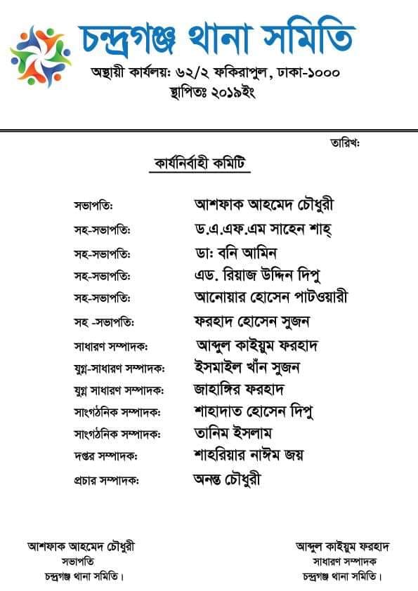 সোমবার চন্দ্রগঞ্জ থানা সমিতির এক জরুরি বৈঠকে চন্দ্রগঞ্জ থানা সমিতির কার্যকরি কমিটি ও উপদেষ্টা কমিটি গঠন করা হয়। কমিটির সকল সদস্যের সম্মতিক্রমে লক্ষীপুর জেলা আওয়ামীলীগের সভাপতি জনাব পিংকু সাহেব কে প্রধান উপদেষ্টা করে উপদেষ্টা কমিটি গঠন করা হয়। সভায় আশফাক আহমেদ চৌধুরী কে সভাপতি, আব্দুল কাইয়ুম ফরহাদকে সাধারন সম্পাদক, ও সাংবাদিক শাহাদাত হোসেন দিপুকে সাংগঠনিক সম্পাদক কওে, ২১ সদস্য বিশিষ্ট পূনাঙ্গ কমিটি অনুমোদন করা হয়। কার্যকরি কমিটির অন্যান্য সদস্যরা হলেন ড. এ এফ এম শাহেন শাহ, ডাঃ বনি আমিন, এড. দিপু, আনোয়ার পাটোয়ারি, ফরহাদ হোসে সুজন, ইসমাইল খাঁন সুজন সহ আরোও অনেকে। এই সময় কার্যকরি কমিটির সদস্যরা বলেন গঠনতন্র অনুয়ায়ী সুশৃঙ্খল ভাবে কমিটি পরিচালনা করা হবে।
