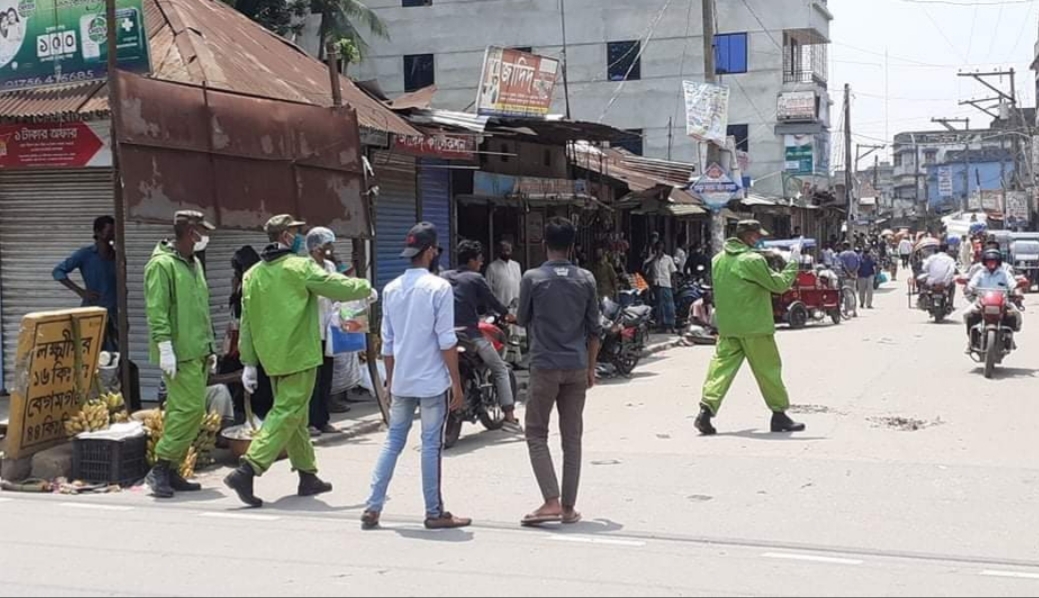 হঠাৎ চারিদিক থেকে শব্দ আসছে “কইরে তোরা, দোকান আটকা-দোকান আটকা-আইতাছে সেনাবাহিনী” এ শব্দ আসার সাথে সাথে ব্যবসাপ্রতিষ্ঠান বন্ধ হতে শুরু করলো। অন্যদিকে প্রধান সড়কে সেনাবাহিনী দেখেই মাক্সবিহীন তিন যুবক পালানোর-সময় আটক হয়ে নয়টি মাক্স কিনে বাড়ী ফিরলো। এভাবে মাক্সবিহীন পথচারি-ছোট যানচলাচলকারিদের মাক্স কিনে বাড়ী ফিরতে বাধ্য হলেন। এ কর্মকান্ড দেখে সচেতনমহন অভিভুত হয়েছেন।